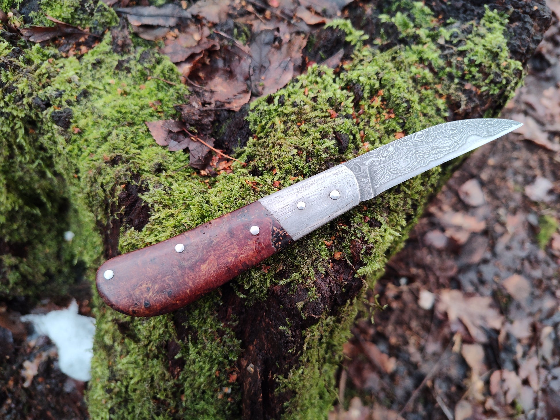 This particular knife has a Wharncliffe blade profile, hand-forged from 200+ layer Damascus with a 1084 carbon steel core. The pattern-welded steel was forged from 1084 and 15n20. With a high flat grind, you'll find that the knife has excellent edge retention and can be quickly sharpened to a razor edge again fairly easily.