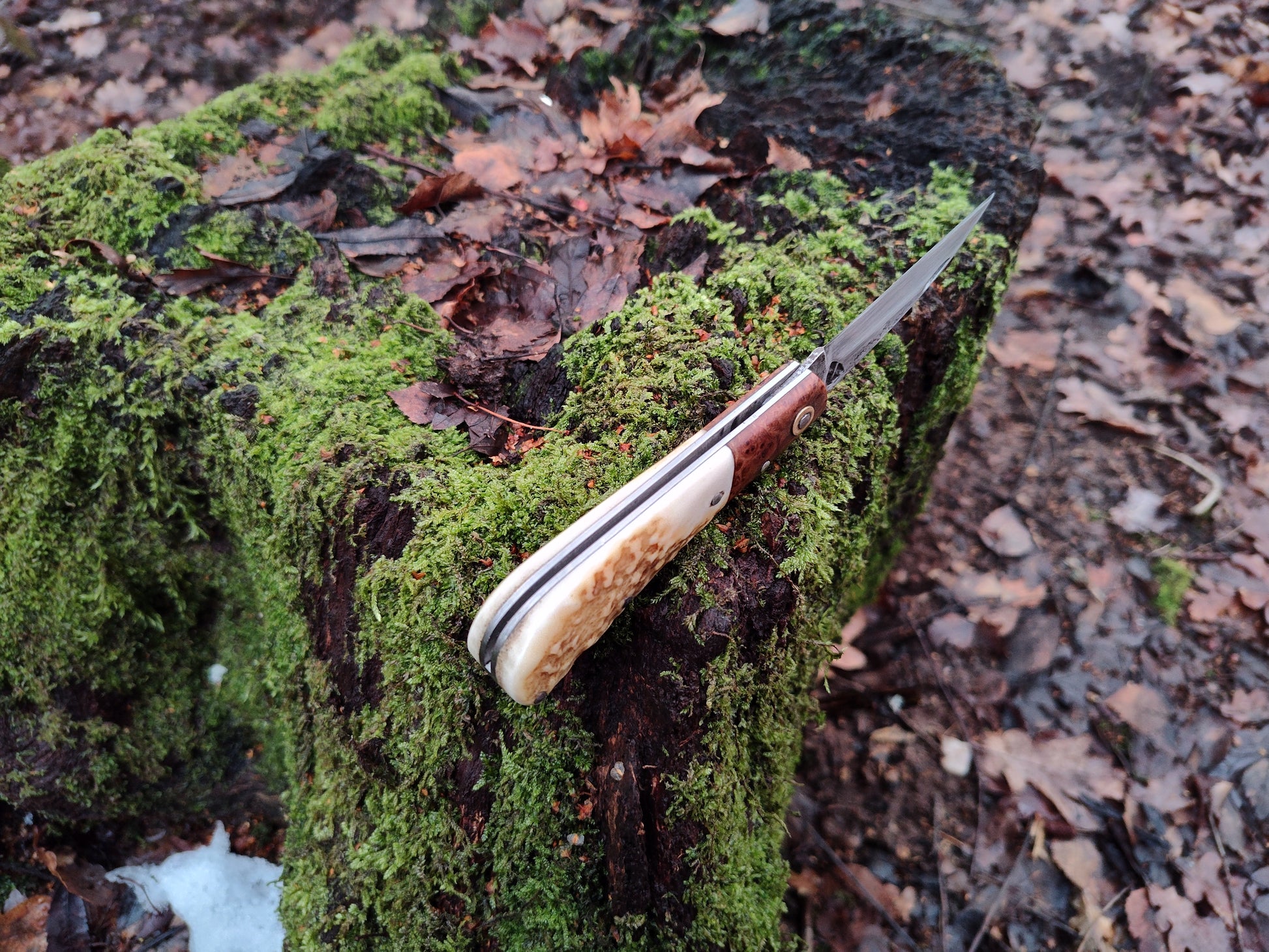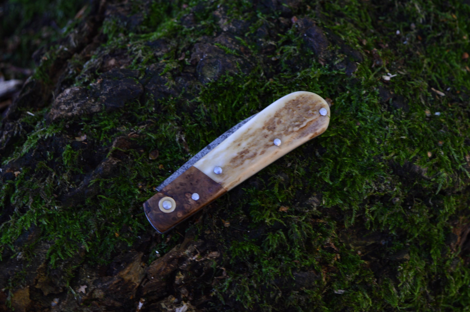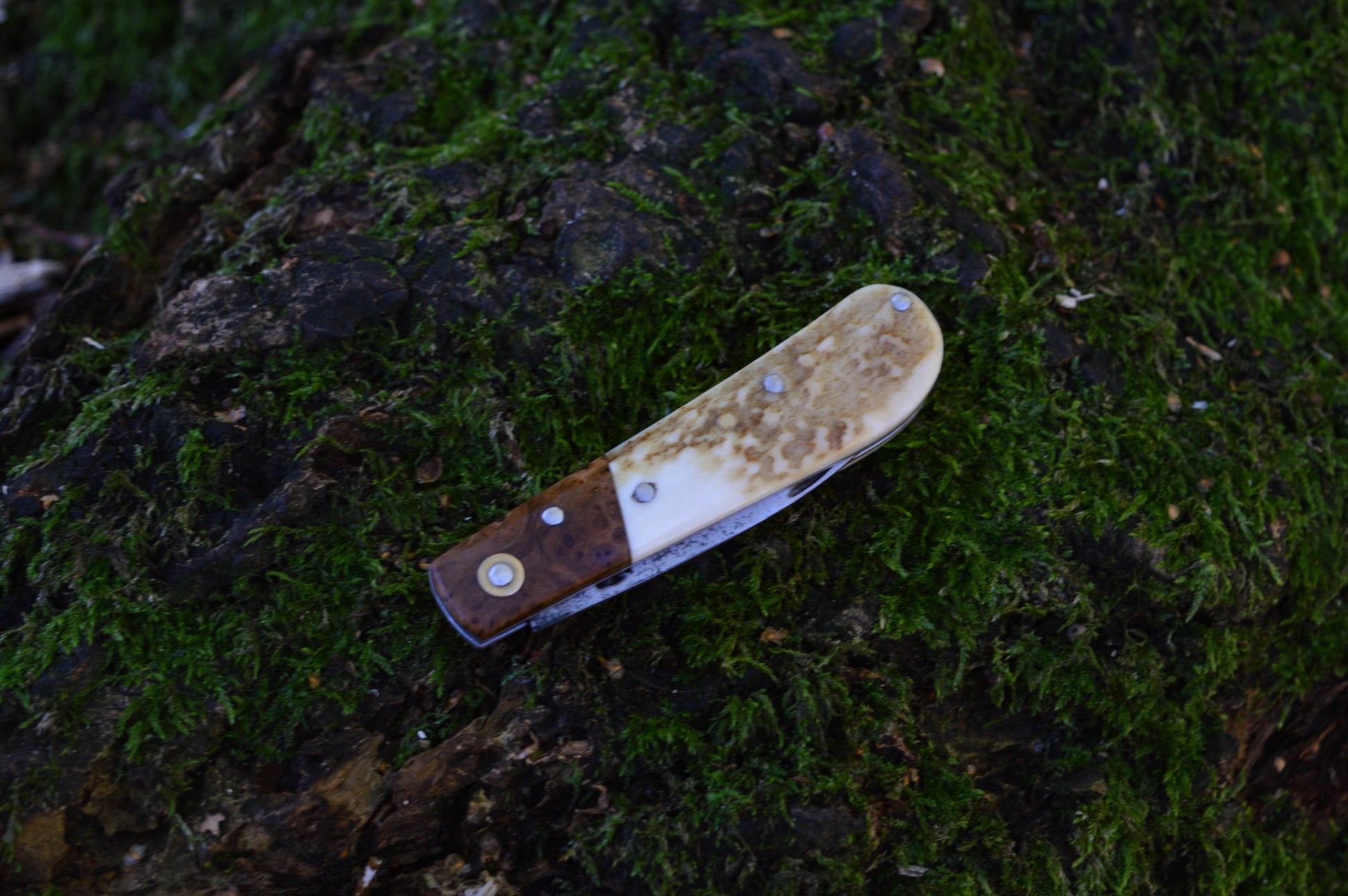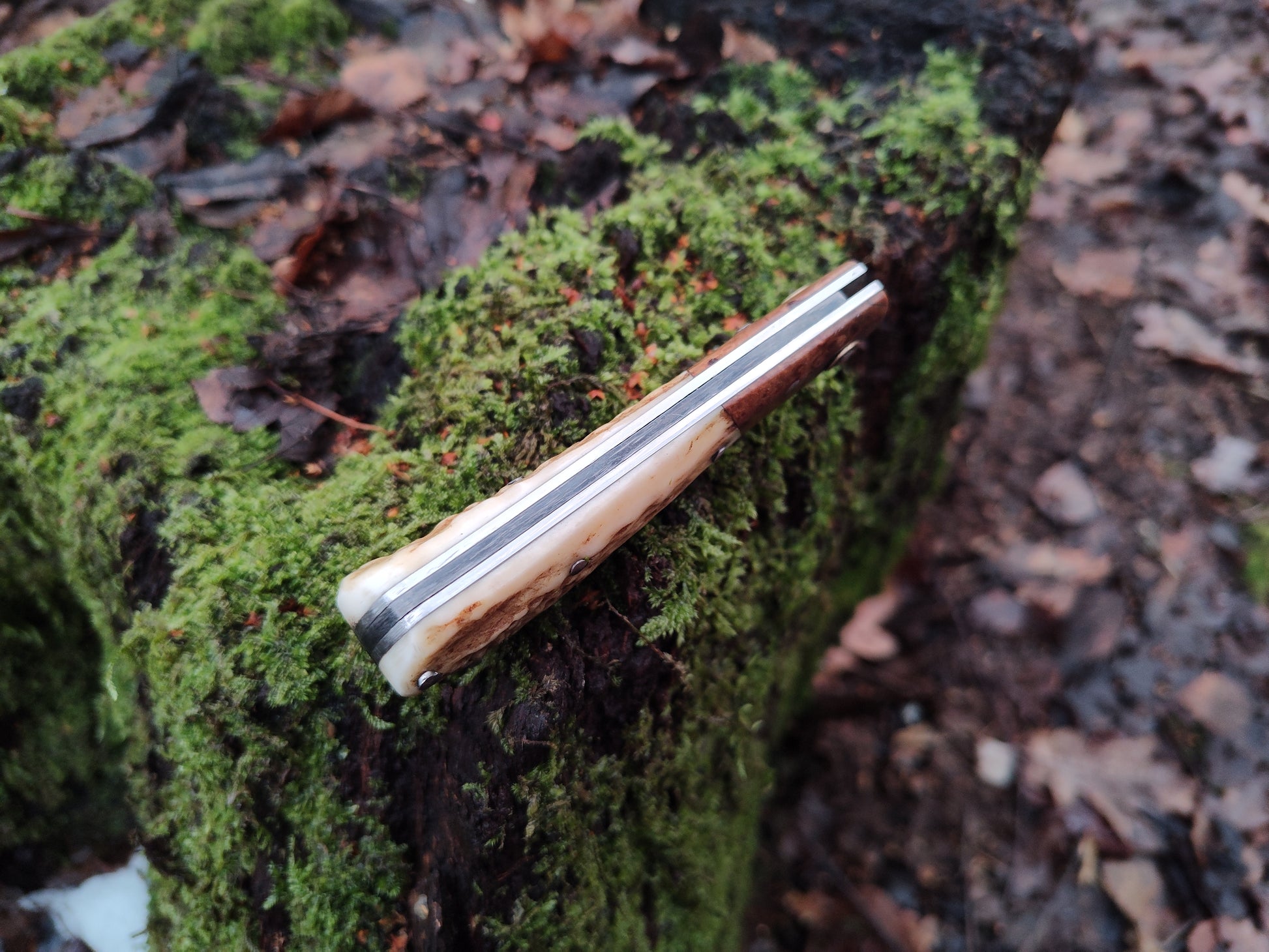 The handle is handmade from stainless liners and stabilized ash burl bolsters with stag scales Both scales and bolsters are mechanically attached with pins. The pins are all made from stainless steel and are domed/peined by hand. The backspring is very strong and has a forced notch mechanism for extra safety - this means that there is a lot of resistance against the blade closing during use, but it is still easy to open the blade and there is no sudden spring shut when you close it. The spring is flush in both positions along the spine.