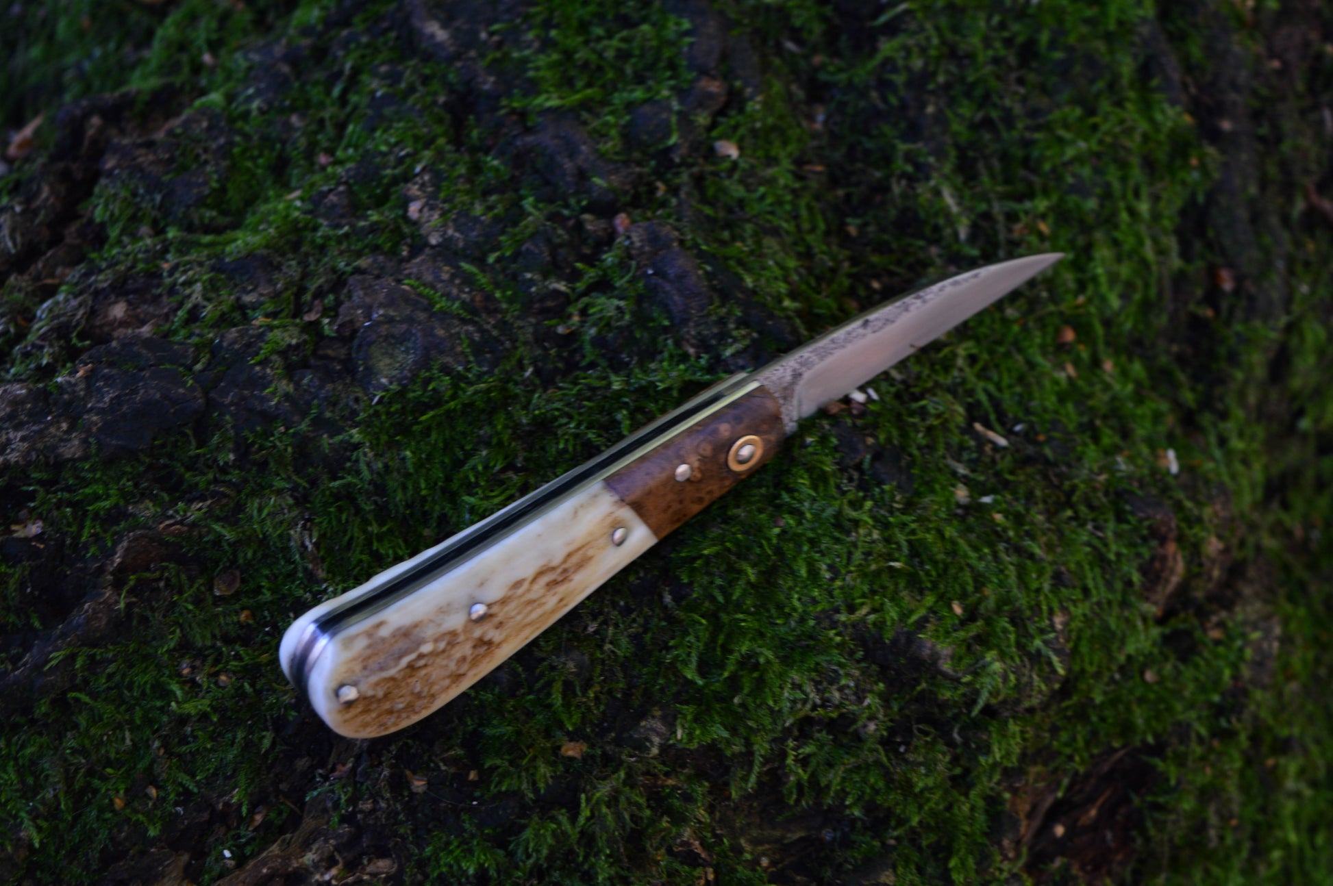 Hand-forged Wharncliffe Slipjoint / UK Legal Folding Knife / Carbon Steel Blade with Ash Burl & Stag Handle