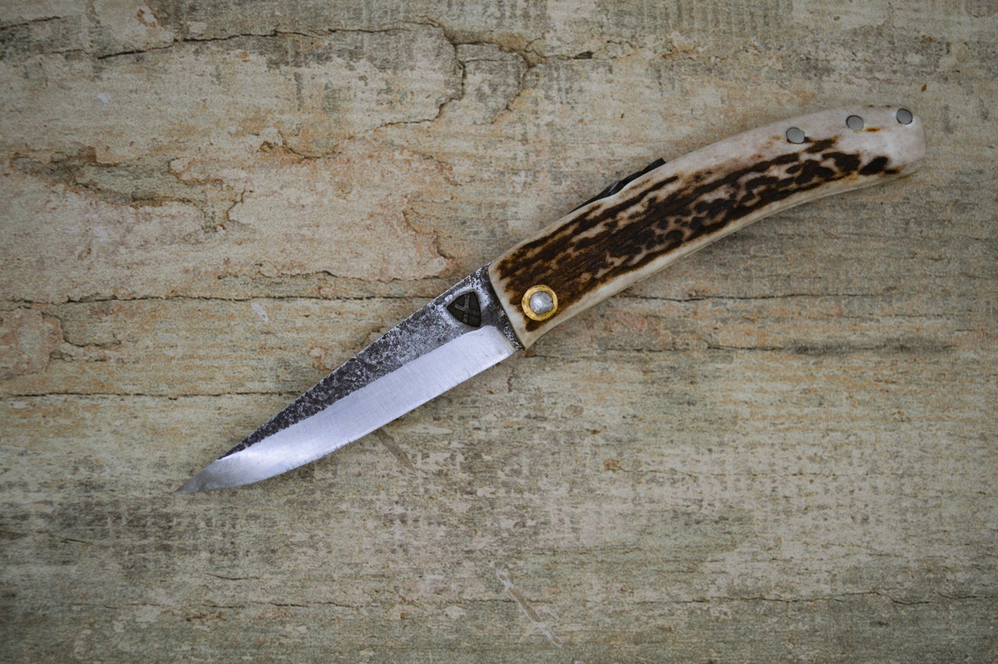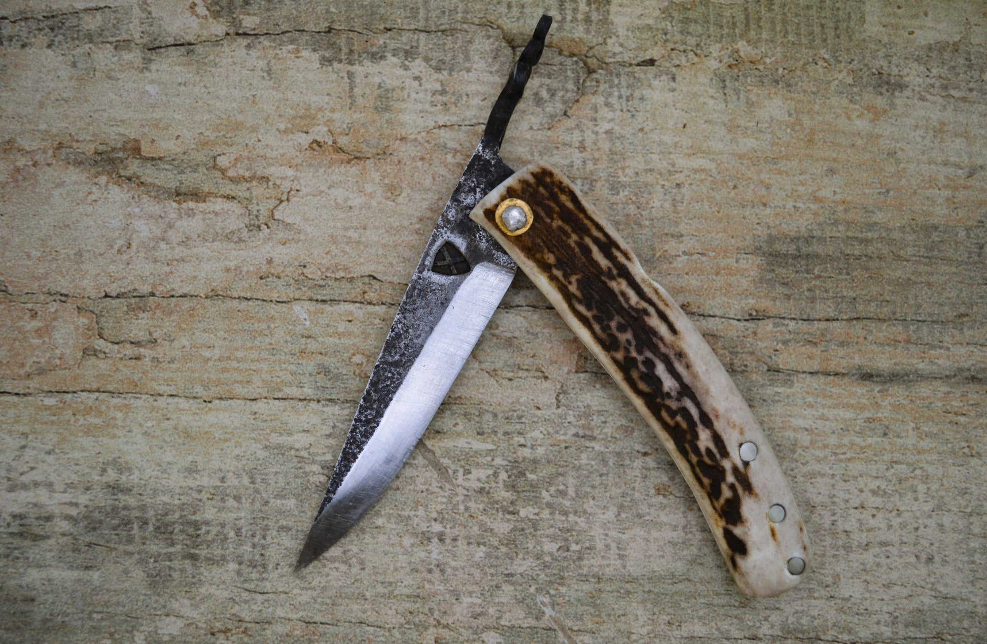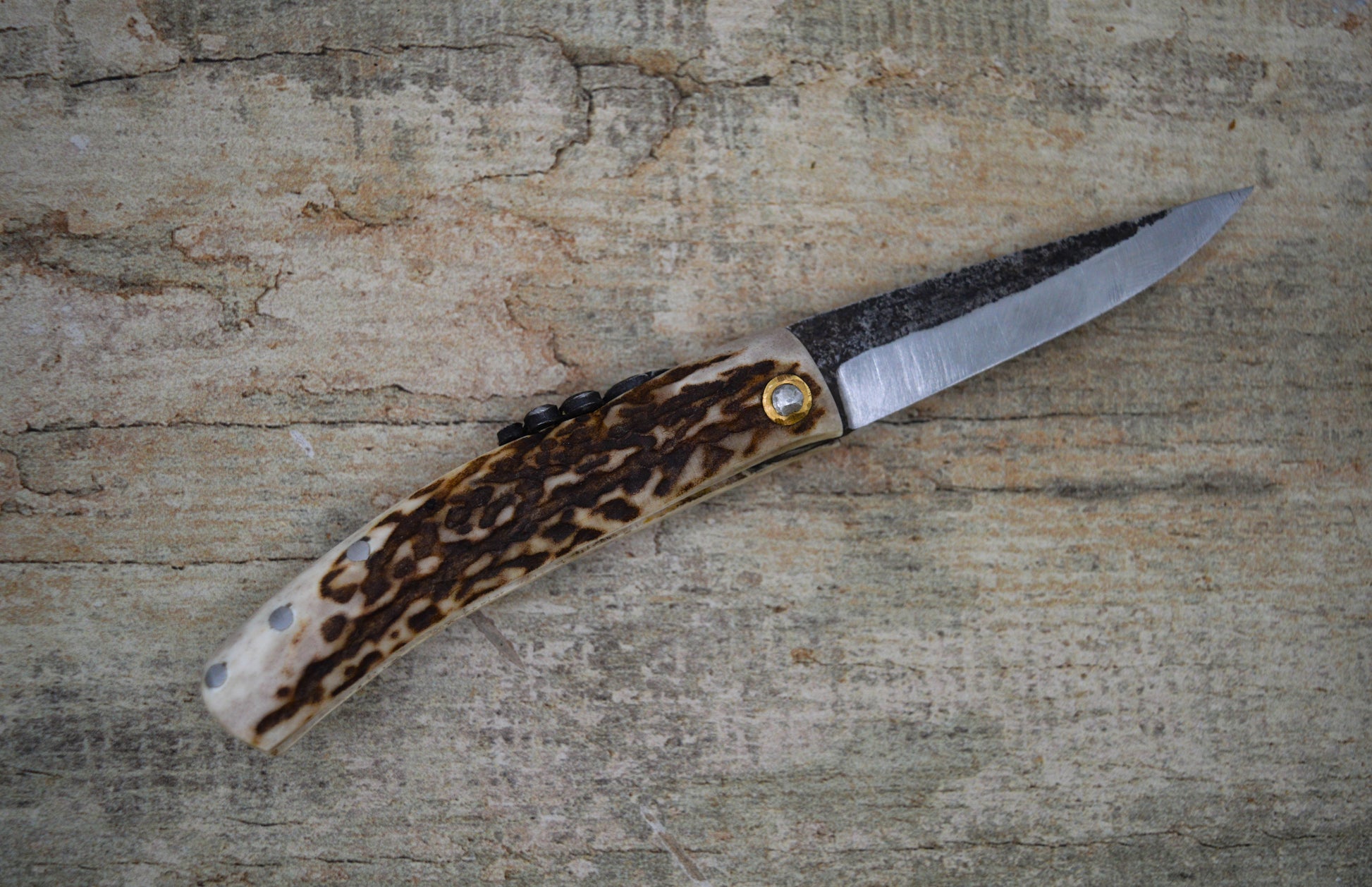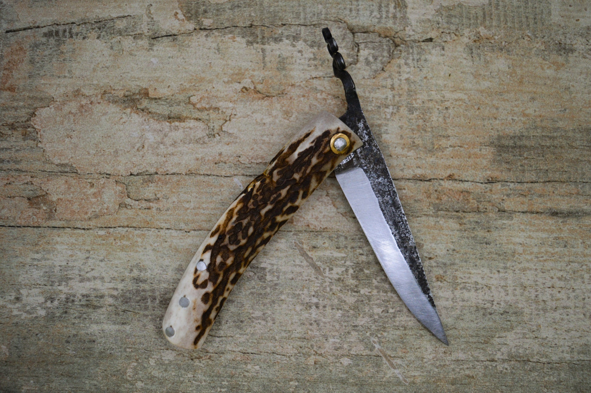 Hand-forged Mountain Man Friction Folder with 80crv2 Carbon Steel Blade, Stag and Amboyna Burl handle