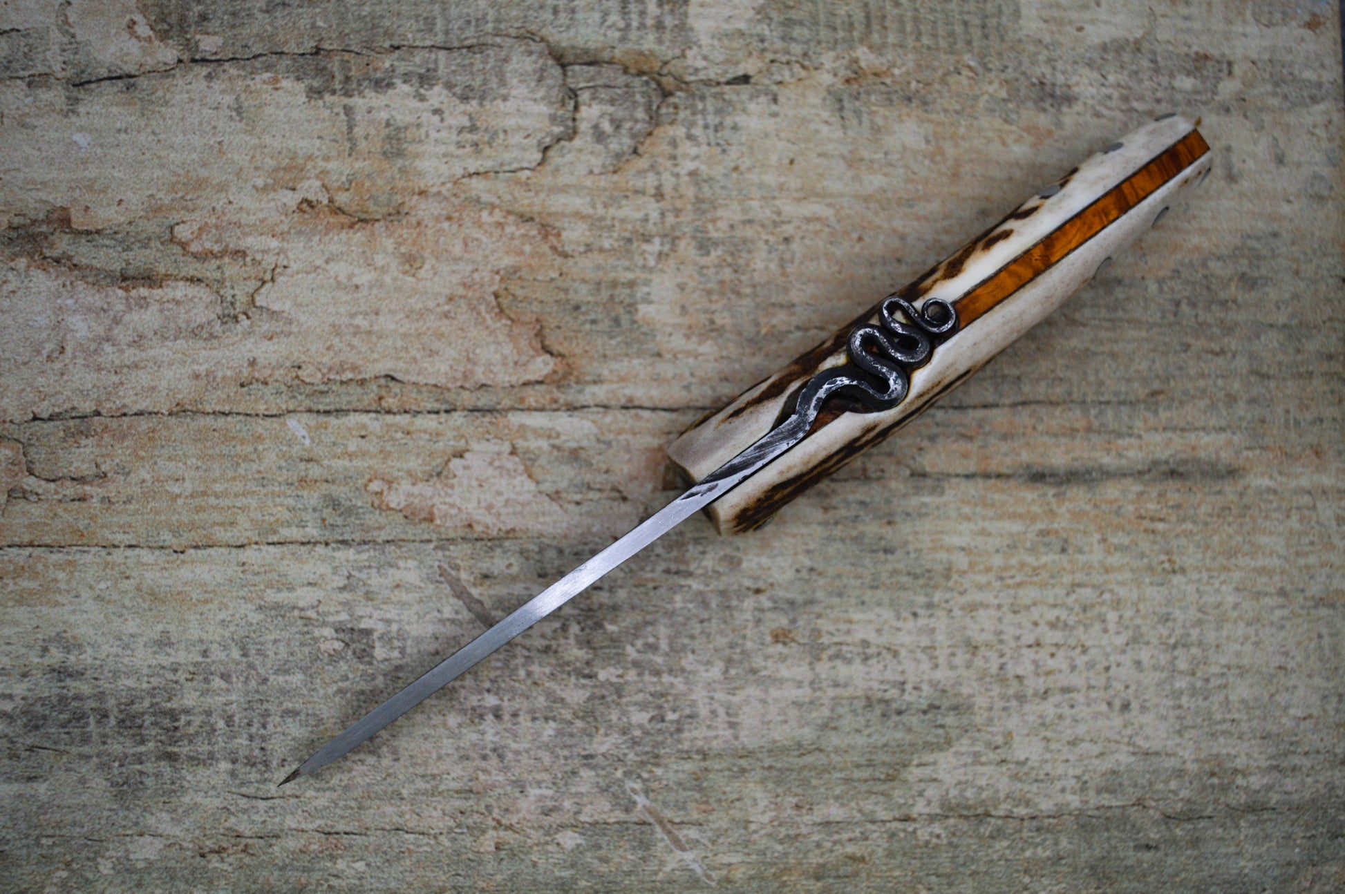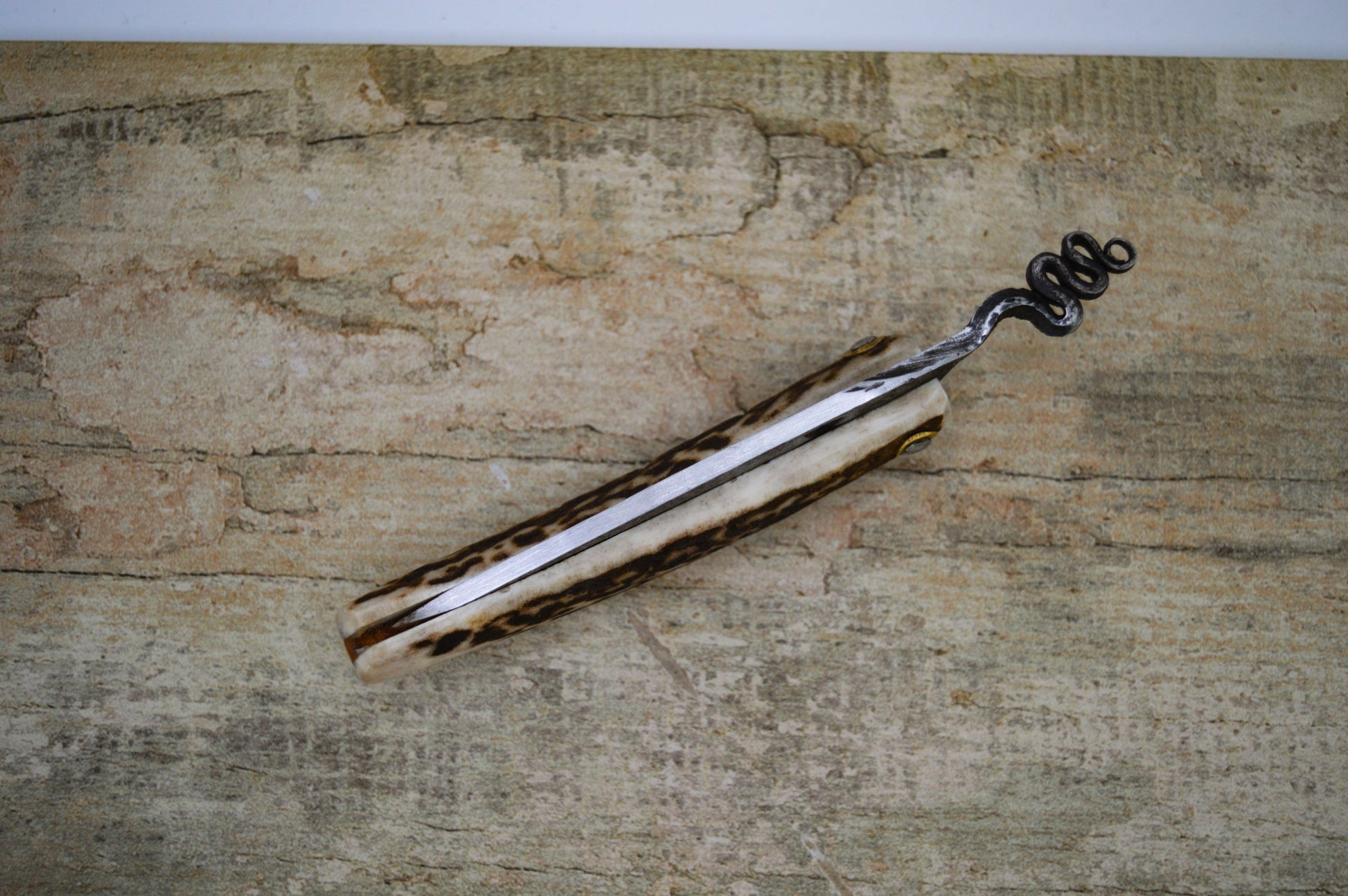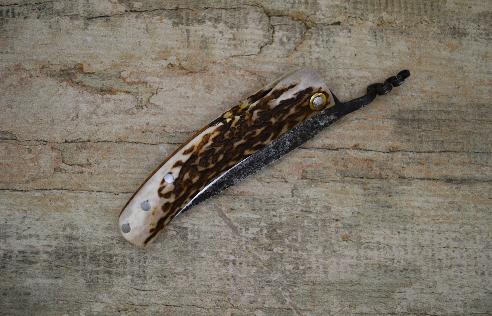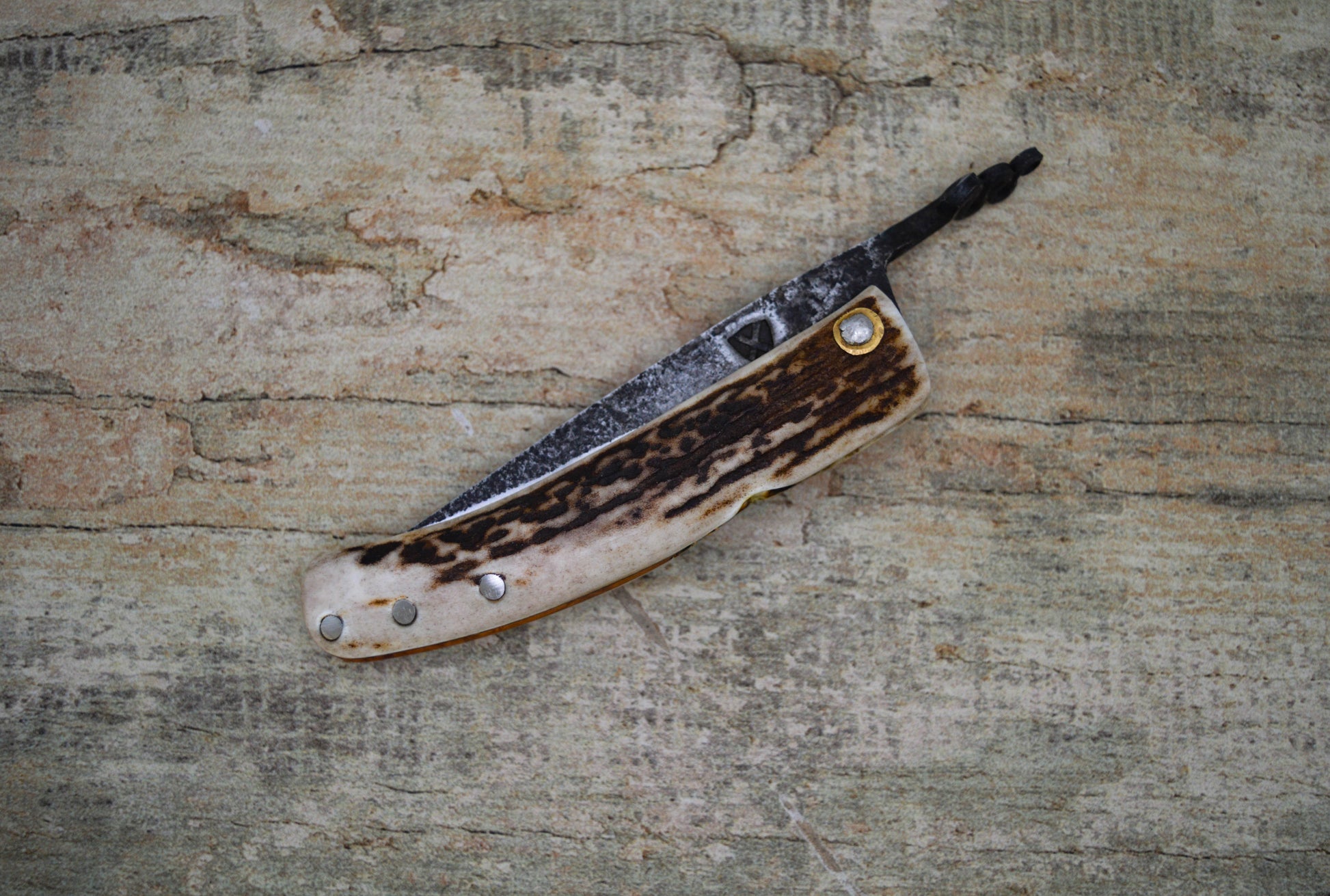 Hand-forged Mountain Man Friction Folder with 80crv2 Carbon Steel Blade, Stag and Amboyna Burl handle