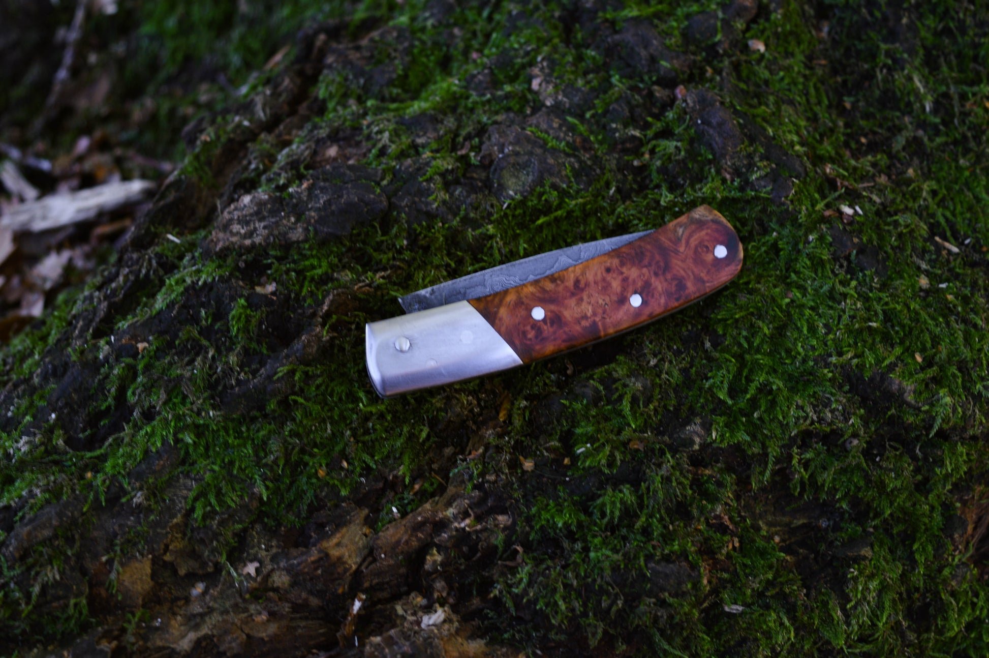 Hand-forged slipjoint folding knife / Pattern-welded Go-Mai Damascus Blade / Stainless Steel Liners & Bolsters / Amboyna Burl Scales